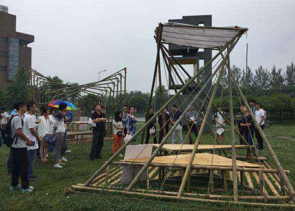 在同学们的橙合唱团进行了表演之后,评审团开始对25个作品进行了评审,各个建造小组主创成员在各自作品前为评委们进行三分钟讲解,包括设计理念,节点构造等,以及回答评委们对方案的提问,中国建筑西南设计研究院常务总建筑师刘艺先生对作品进行了细致、精彩的点评。
