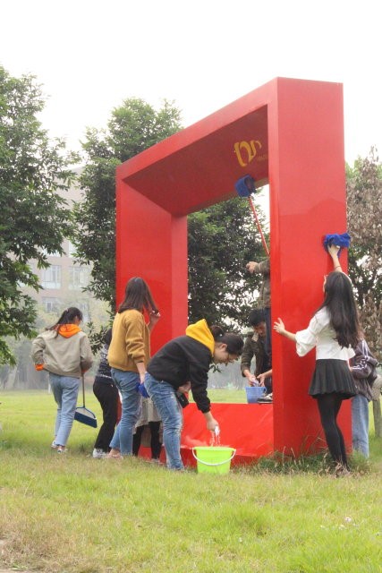 正午十二点,志愿者们来到浙园,开始对其中的雕塑和钟楼进行清洁。浙园湖畔的雕塑是我校校友于120周年校庆之际所捐赠修建,其中红色相框上写有"120"的字样便代表着交大建立120周年。它承载着交大人对我校美好的祝愿,具有重要的意义。同样刻有“竢实扬华”字样的钟楼,也记录了我校的变迁和悠远的历史。